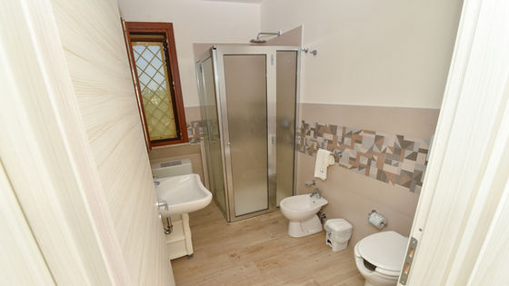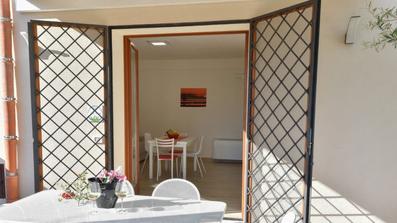 Il bilocale è dotato di cucina/soggiorno con divano-letto matrimoniale, bagno, camera con 2 letti singoli o un matrimoniale e un divano-letto singolo, disimpegno e un ampia veranda privata.